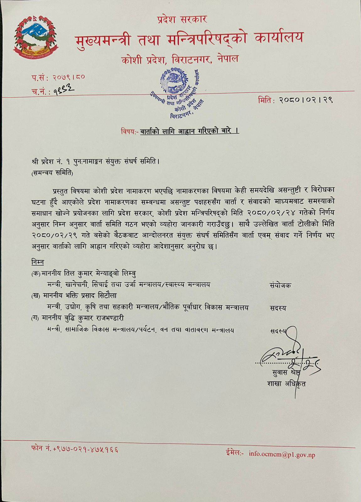 कोसी प्रदेश सरकारद्वारा पहिचान पक्षलाई वार्ताका लागि औपचारिक आह्वान