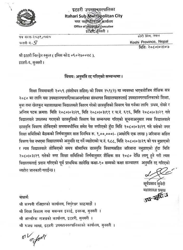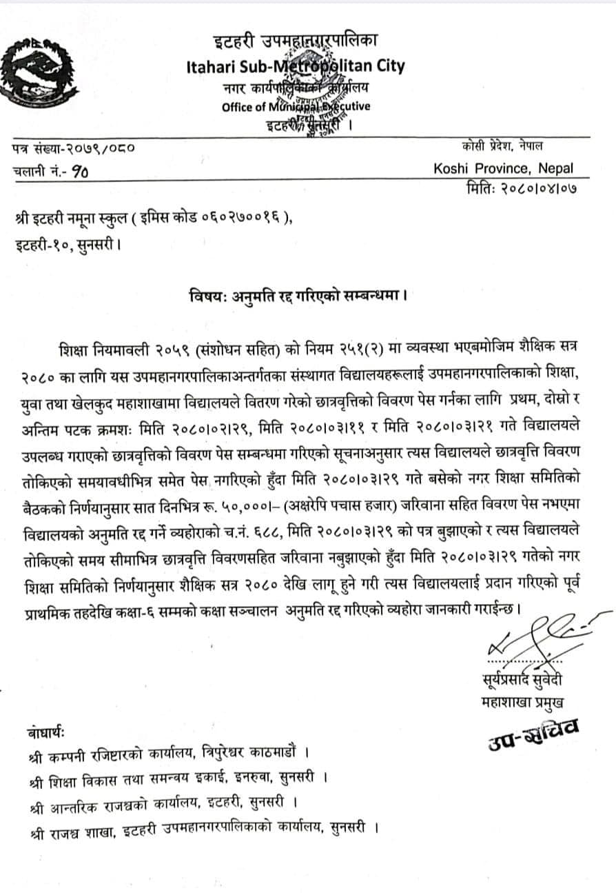 शिक्षा नियमावली २०५९ (संशोधन सहित)को नियम २५१(२) मा व्यवस्था भए बमोजिम शैक्षिक सत्र २०८० का गरेको छात्रवृत्तिको विवरण पेस नगरेकाले अनुमति खारेजी गरेको इटहरी उपमहानगरका शिक्षा महाशाखा प्रमुख सूर्यप्रसाद सुवेदीले बताए ।