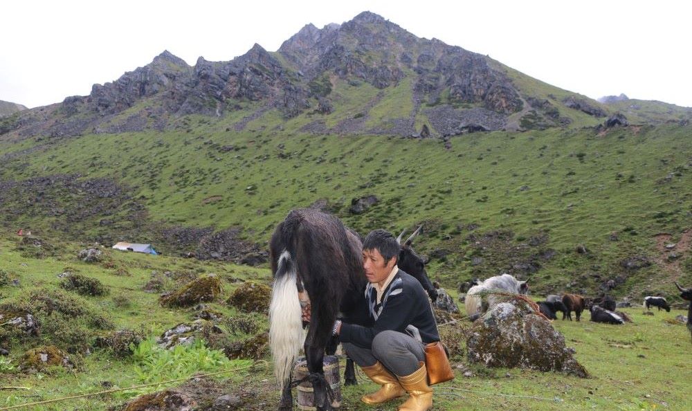 ताप्लेजुङ : समुद्र सतहदेखि चार हजार ४५० मिटर उचाइमा अवस्थित ताप्लेजुङको मिक्वाखोला गाउँपालिका ५ पाँचपाङ्गाला क्षेत्रमा रहेको चौँरी गोठमा चौँरी (जमु) को दूध दुहुँदै एक किसान ।