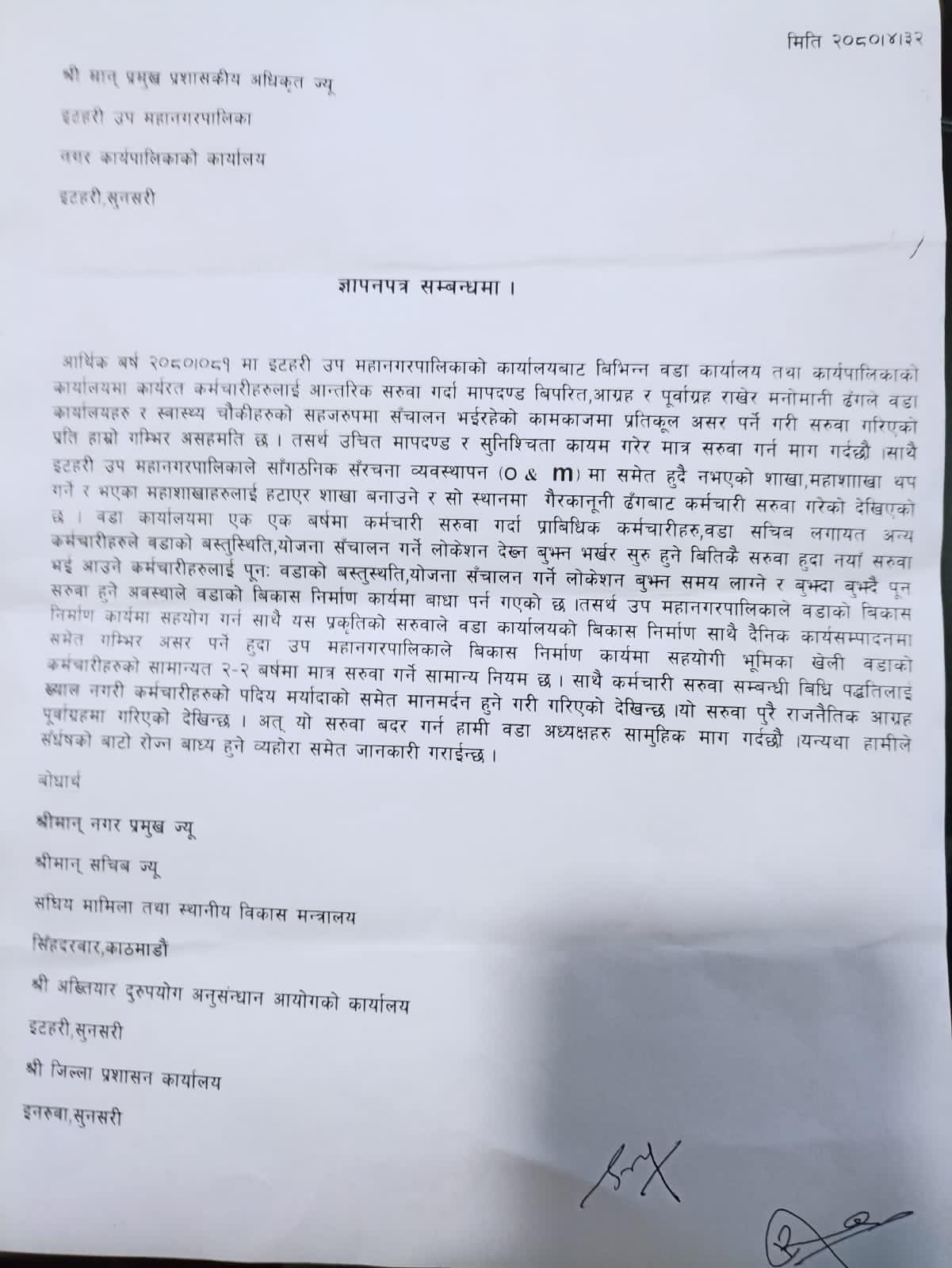 ज्ञापनपत्रको बोधार्थमा नगर प्रमुख, संघीय मामिला तथा स्थानीय विकास मन्त्रालय, अख्तियार दुरुपयोग अनुसंन्धान आयोगको कार्यालय र जिल्ला प्रशासन कार्यालय उल्लेख गरिएको छ ।
