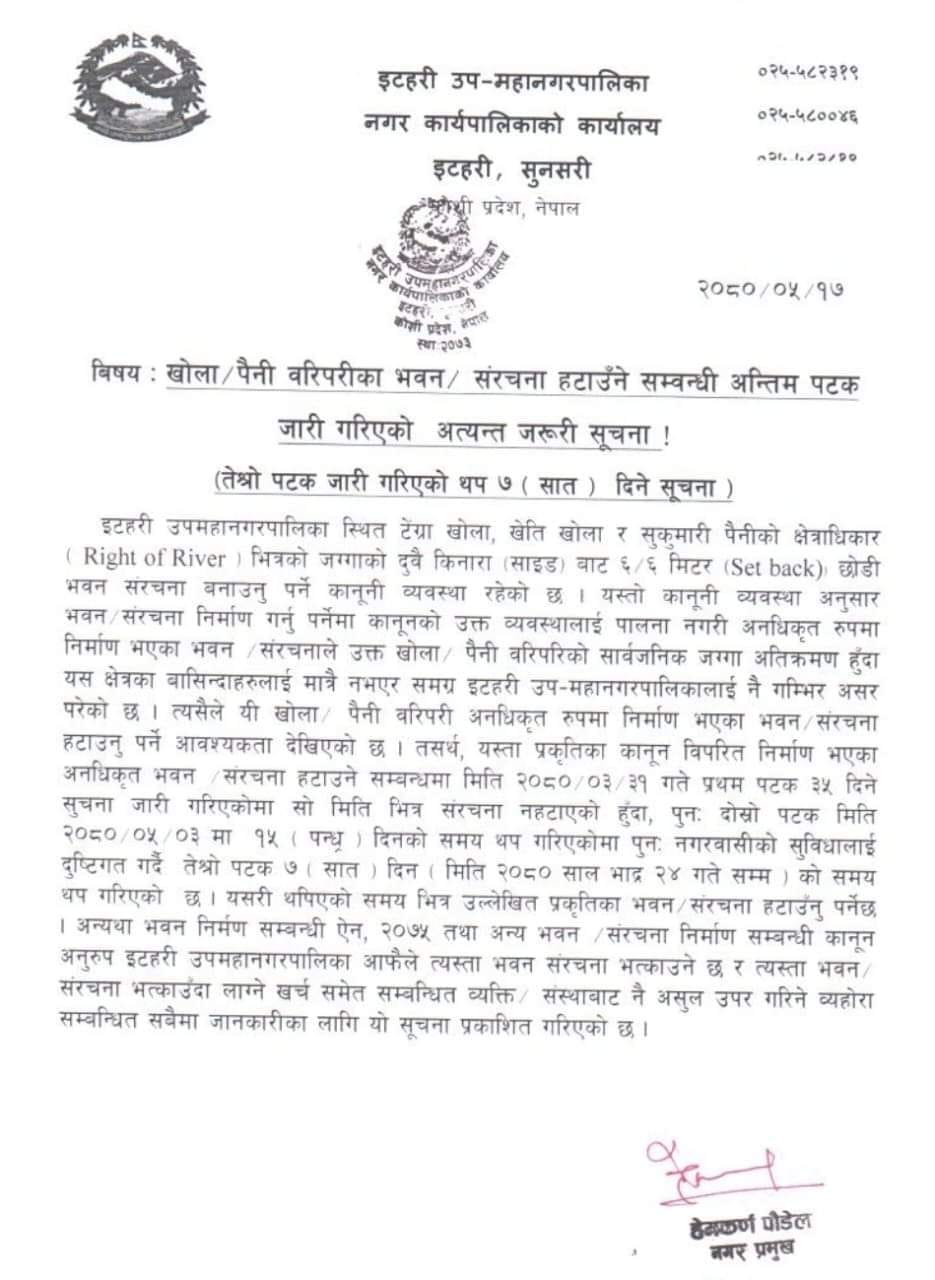 इटहरी : इटहरी उपमहानगरपालिकाले खोला पैनी मिचेर बनाएका अवैध संरचना भत्काउन अन्तिम पटक म्याद थप गरेको छ ।