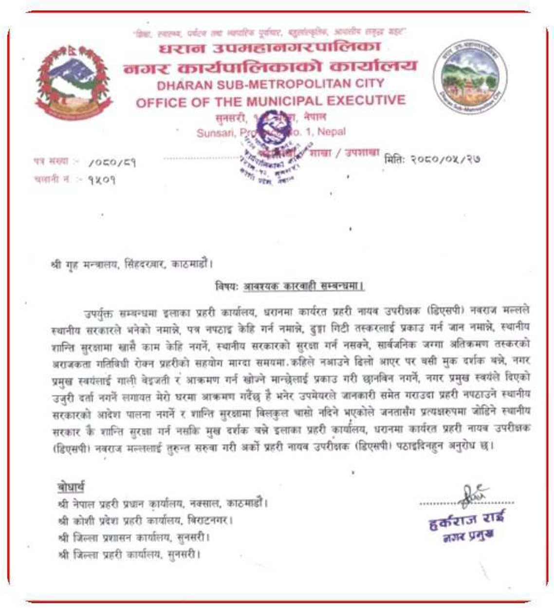 आदेश नमानेको भन्दै डीएसपी सरुवा गर्न धरानका मेयरले काटे गृह मन्त्रालयलाई पत्र