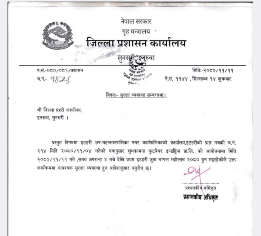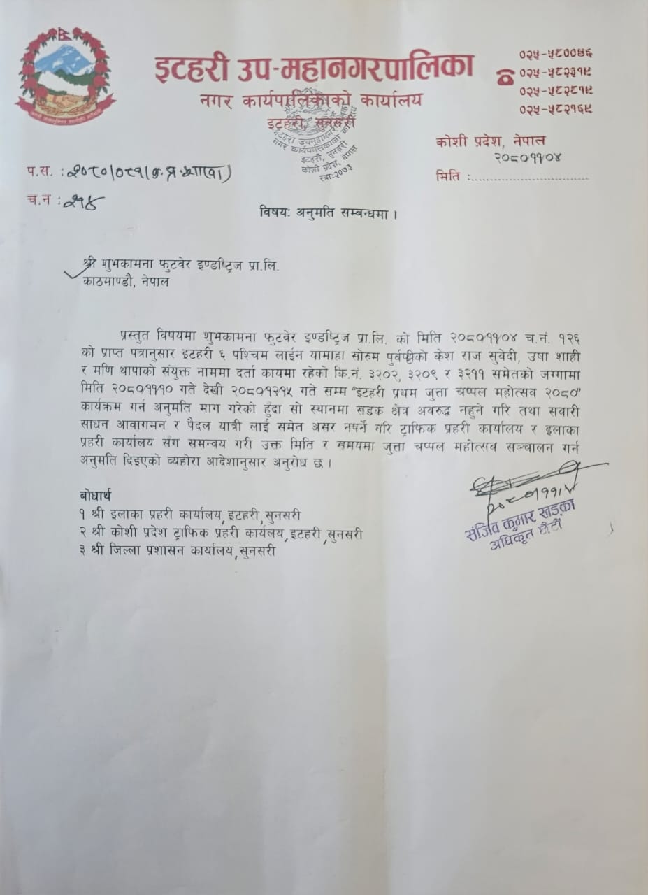 शुक्रबार (फागुन ११) देखि ३५ दिन (चैत १५) सम्म इटहरीमा शुभकामना फुटवेयर इन्ड्रष्ट्रिज प्रालिले जुत्ता–चप्पल मेला लगाउने प्रशासनको अनुमति लिएपनि इटहरीका व्यापारीहरूले अवरोध गरेका हुन् ।