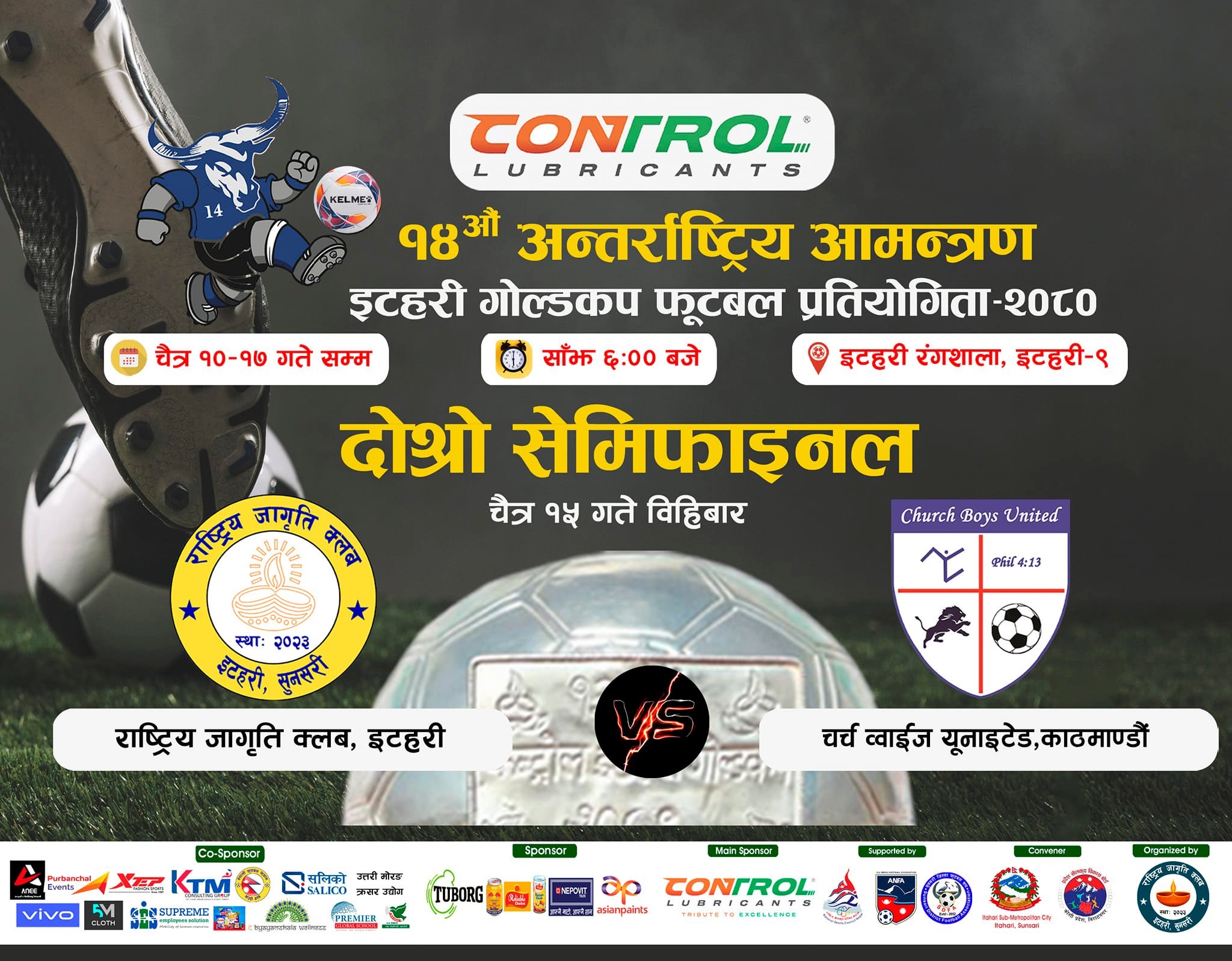 इटहरी : १४ औँ संस्करणको इटहरी गोल्डकपको अन्तिम सेमीफाइनल खेलमा आज (बिहीबार) गत वर्षको उपबिजेता चर्च ब्वाईज युनाइटेड काठमाण्डौं र आयोजक राष्ट्रिय जागृति क्लबबिच प्रतिष्पर्धा हुँदैछ ।