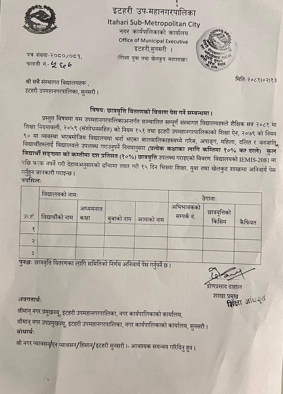 इटहरीका संस्थागत विद्यालयलाई छात्रवृत्तिको विवरण पेस गर्न उपमहानगरको निर्देशन