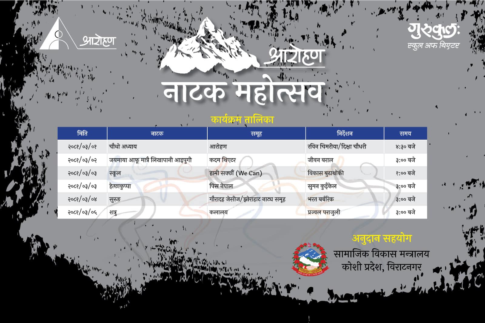 असार ३ गते दिउँसो १ बजे ह्वी क्यान संस्थाले ‘स्कूल’ मञ्चन गर्दा सोही दिन दिउँसो ३ बजे पिस नेपालले ‘हेत्छाकुप्पा’ मञ्चन गर्नेछ ।