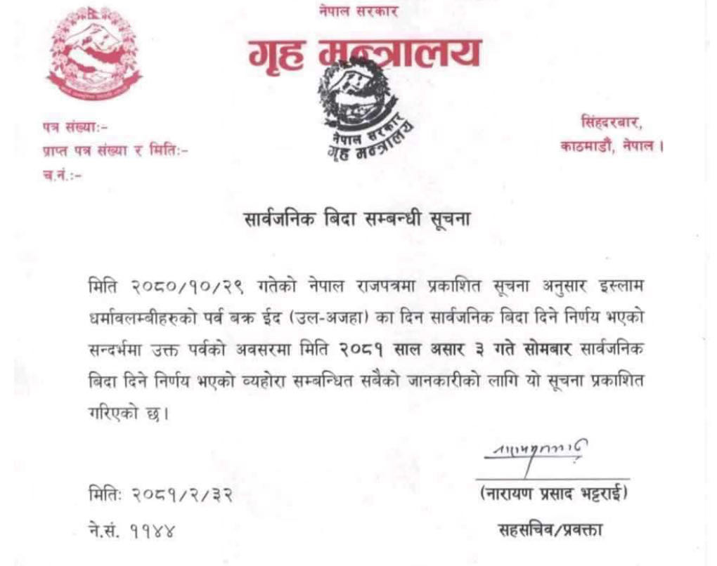 इस्लाम धर्मावलम्बीहरूको पर्व बक्र ईद (उल–अजहा)का अवसरमा विदा दिने निर्णय भएको गृह मन्त्रालयले जनाएको छ ।