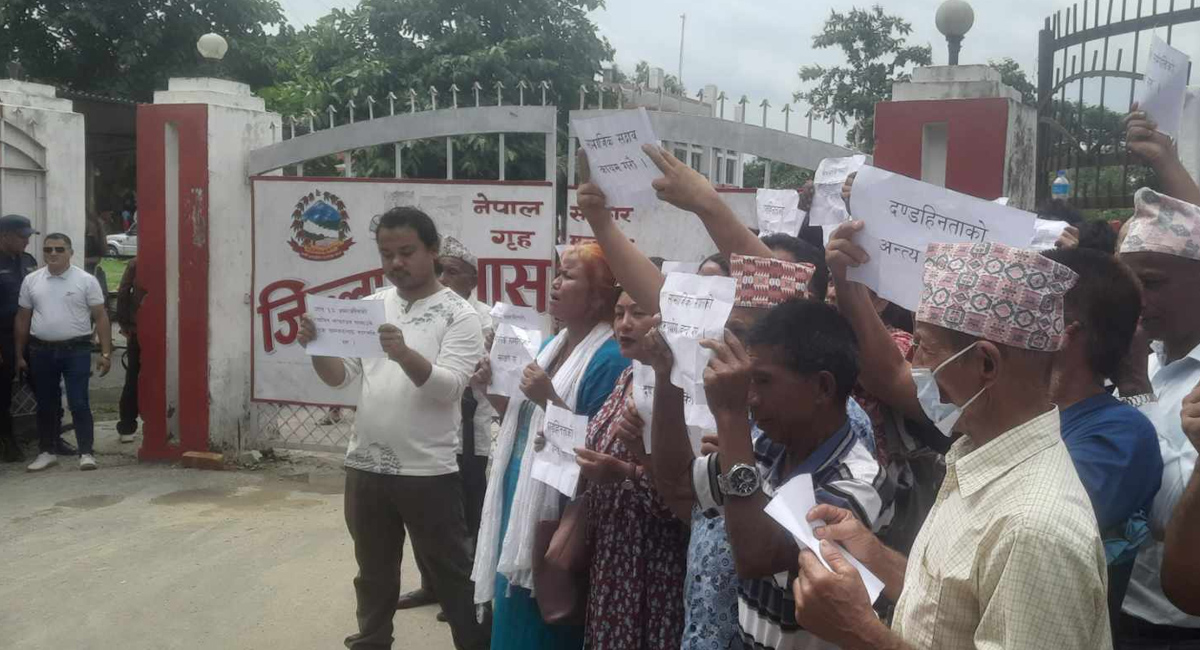 प्लेकार्डसहित कार्यालयमा उपस्थित भएका स्थानीयले तार जाली भत्काउन लगाउने हर्क साम्पाङलाई कारबाही गर्, शान्ति सुरक्षा कायम गर्, सामाजिक सद्भाव कायम गर्, सार्वजनिक सम्पत्तिको संरक्षण गर जस्ता नाराबाजी गरेका थिए ।