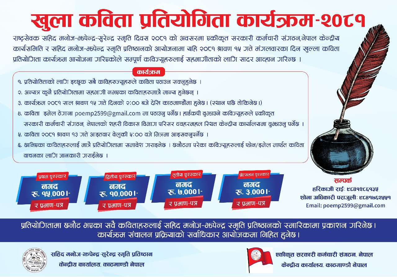 सहिद–मनोज–झपेन्द्र स्मृति प्रतिष्ठान र एकीकृत सरकारी कर्मचारी संगठन नेपालको संयुक्त आयोजनामा आगामी साउन १५ गते प्रतियोगिता आयोजना गर्न लागिएको हो । प्रतियोगिताका लागि कविता आह्वान गरिएको छ ।
