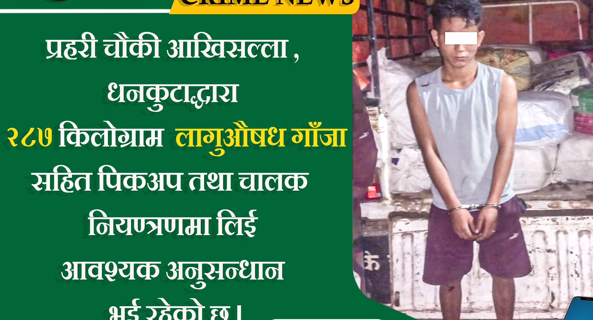 लागूऔध गाँजा बरामद भएसँगै ओसारपोसारमा संलग्न पिकअप चालक सहिदभूमी ४ का २५ वर्षीय मेघराज राईलाई प्रहरीले नियन्त्रणमा लिएको छ ।