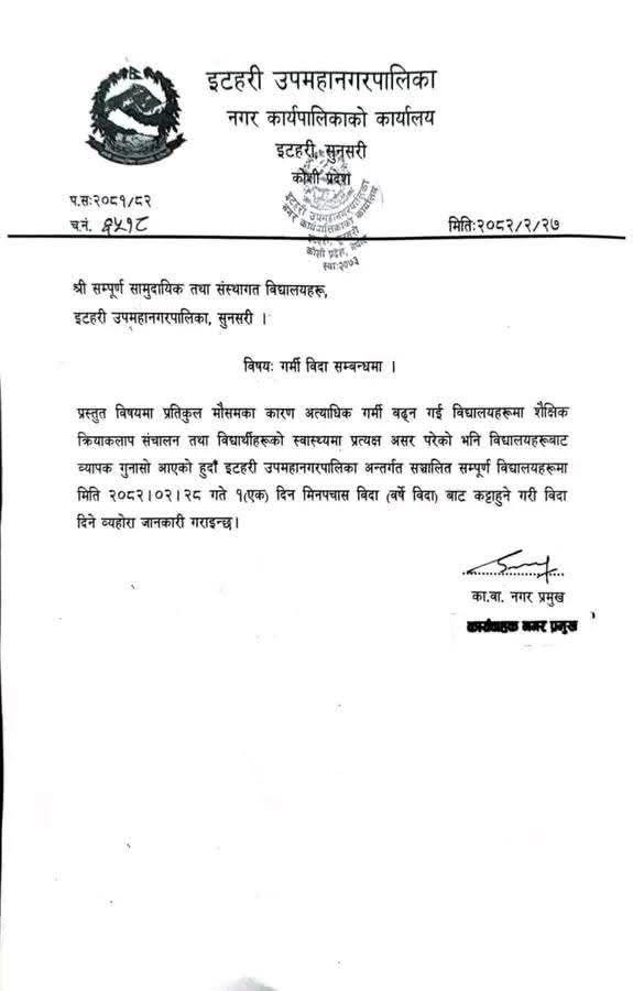 इटहरी : इटहरी उपमहानगरपालिकाले अत्यधिक गर्मीका कारण एक दिनका लागि सम्पूर्ण सामुदायिक तथा संस्थागत विद्यालयहरू बिदा गर्ने निर्णय गरेको छ।