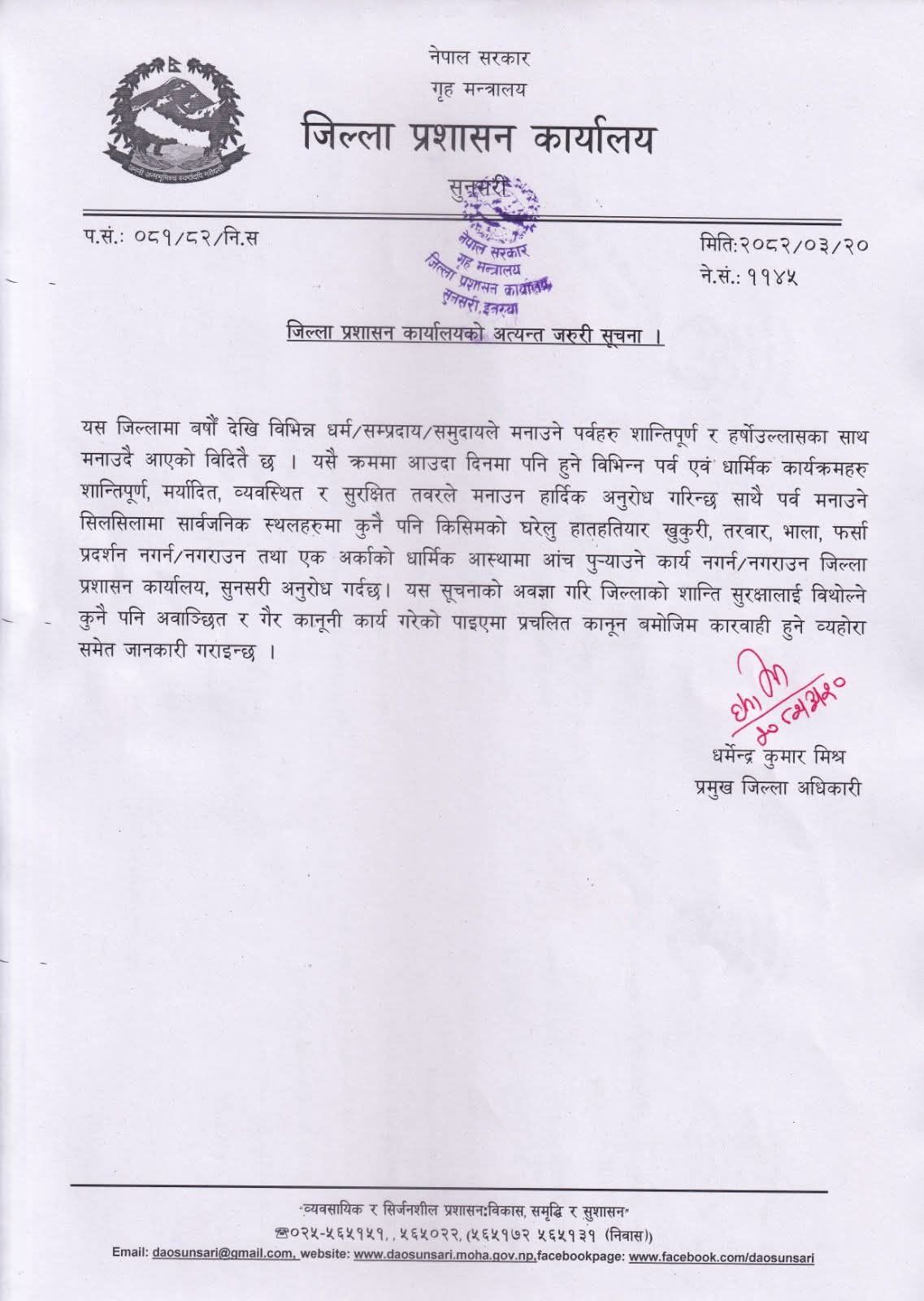 जिल्ला प्रशासन कार्यालय सुनसरीका प्रमुख जिल्ला अधिकारी धर्मेन्द्र कुमार मिश्रद्वारा हस्ताक्षरित सूचनाअनुसार विगतका वर्षहरूमा जस्तै यस वर्ष पनि विभिन्न पर्वहरू मनाउने क्रममा जिल्लामा शान्ति, सुव्यवस्था, मर्यादा र सुरक्षालाई ध्यानमा राख्दै कुनै पनि किसिमका घरेलु हतियारजस्तै तरबार, खुकुरी, भालाजस्ता वस्तुहरू सार्वजनिक स्थलमा बोकी नआउन र प्रदर्शन नगर्न/नगराउन निर्देशन दिइएको हो।