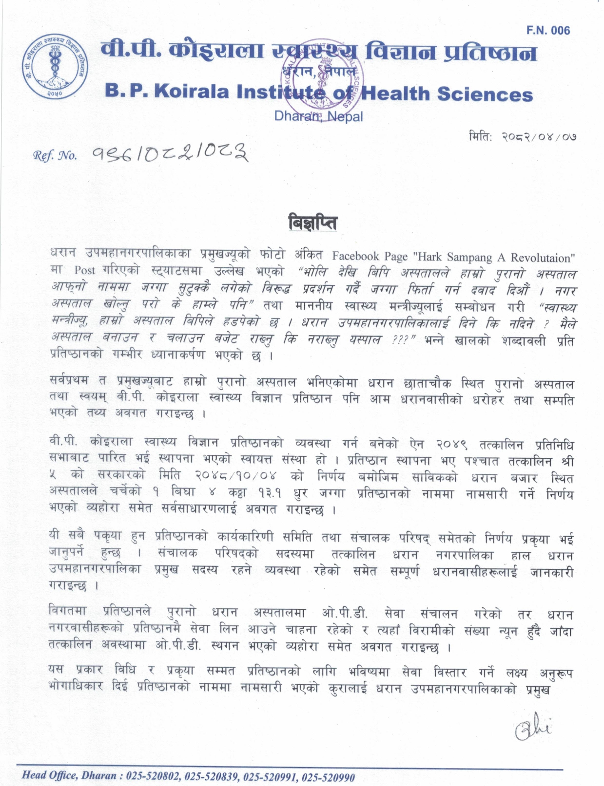 विज्ञप्तिमा भनिएको छ, “प्रमुखज्यूबाट हाम्रो पुरानो अस्पताल भनिएकोमा धरान छाताचौक स्थित पुरानो अस्पताल तथा स्वयम् बीपी कोइराला स्वास्थ्य विज्ञान प्रतिष्ठान पनि आम धरानवासीको धरोहर तथा सम्पति भएको तथ्य अवगत गराइन्छ ।”