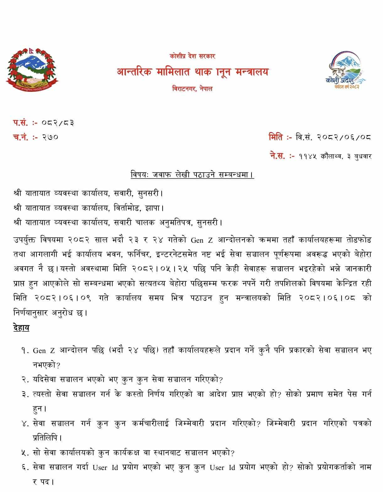 कार्यालय जलेर प्रयोगविहीन भएपछि आन्तरिक मामिला तथा कानून मन्त्रालय, कोशीले मातहतका सबै कार्यालयलाई “सेवा स्थगित” गर्ने परिपत्र जारी गर्यो। सेवाग्राहीलाई स्पष्ट सूचना दिइयो, नयाँ सवारी दर्ता हुन सक्दैन।