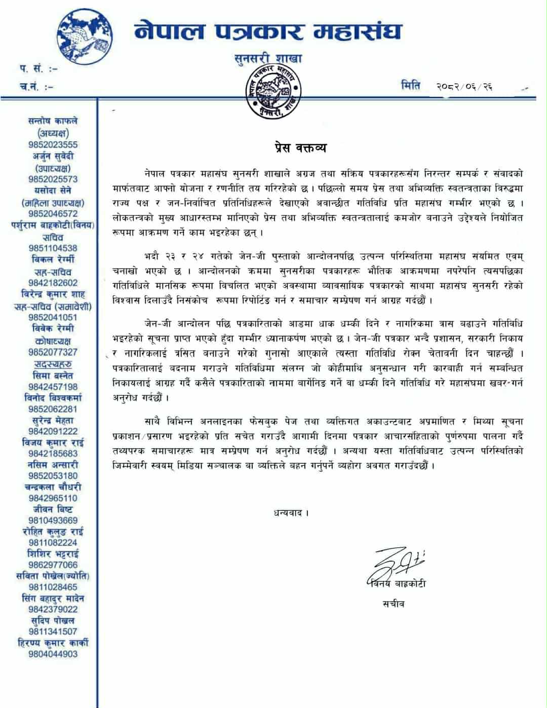 ‘जेनजी आन्दोलनको क्रममा सुनसरीका पत्रकारहरू भौतिक आक्रमणमा नपरेपनि त्यसपछिका गतिविधिले मानसिक रूपमा विचलित भएको अवस्थामा व्यावसायिक पत्रकारको साथमा महासंघ सुनसरी रहेको विश्वास दिलाउँदै निशंकोच रूपमा रिपोर्टिङ गर्न र समाचार सम्प्रेषण गर्न आग्रह गर्दछौं,’ विज्ञप्तिमा भनिएको छ।