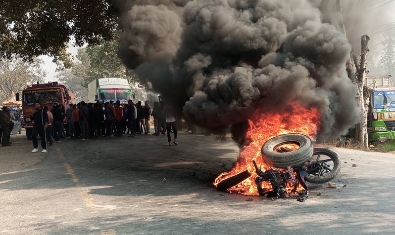 प्रदर्शनकै क्रममा ठाकुरको प्रदेश नम्बर १-०२-००४९ प ५९९४ नम्बरको मोटरसाइकलमा आगजनी गरिएको छ।