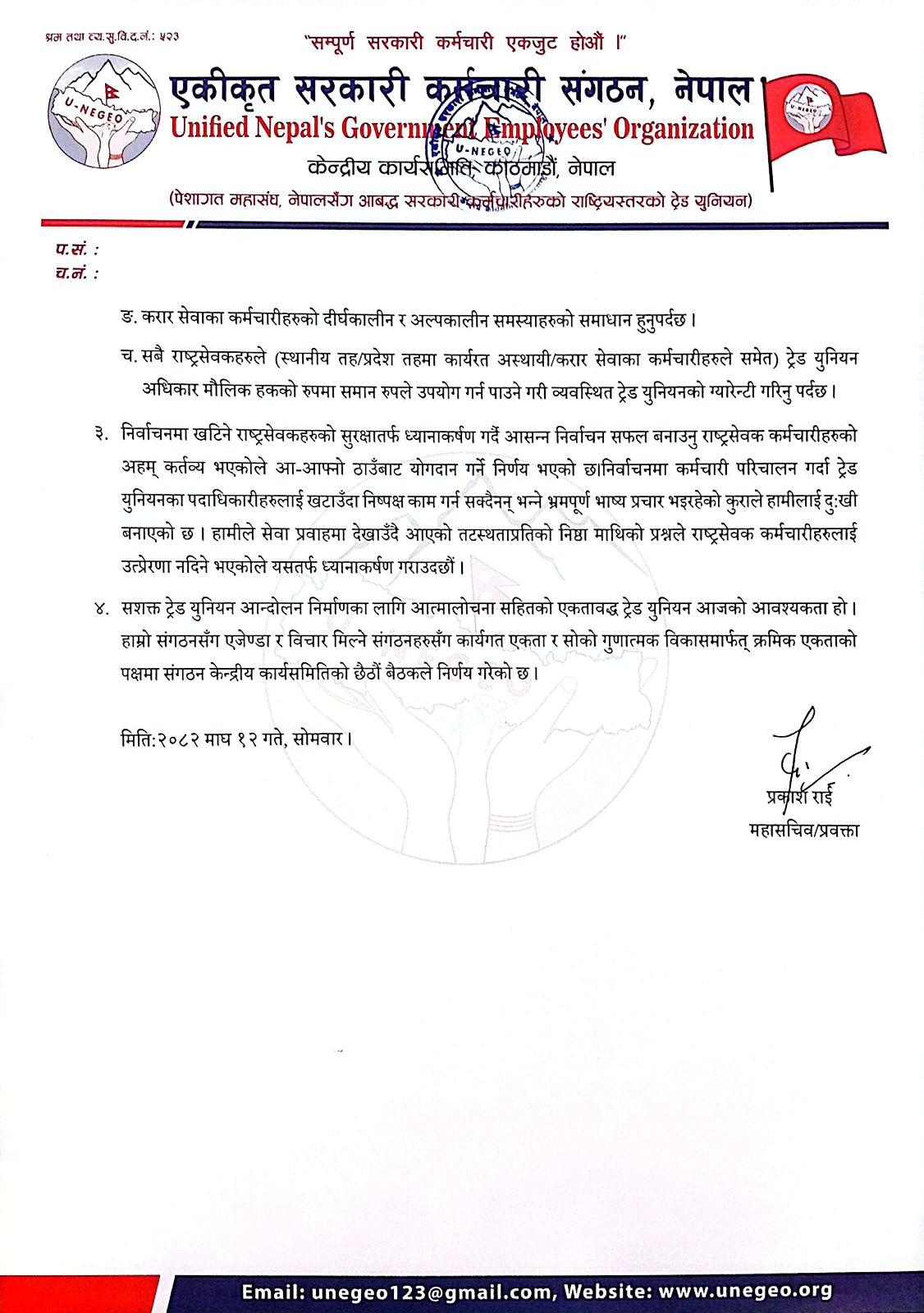 उनका अनुसार ट्रेड युनियनका पदाधिकारी निर्वाचनमा खटिँदा निष्पक्ष काम गर्न सक्दैनन् भन्ने भ्रमपूर्ण भाष्यप्रति संगठनले आपत्ति जनाएको छ।