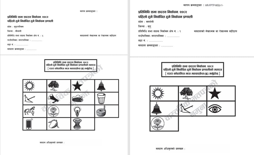 ती सबै निर्वाचन क्षेत्रको मतपत्रको नमूना पनि आयोगले सार्वजनिक गरेको छ । समानुपातिक निर्वाचन प्रणालीतर्फका मतपत्रको छपाइ भइसकेकोे छ ।