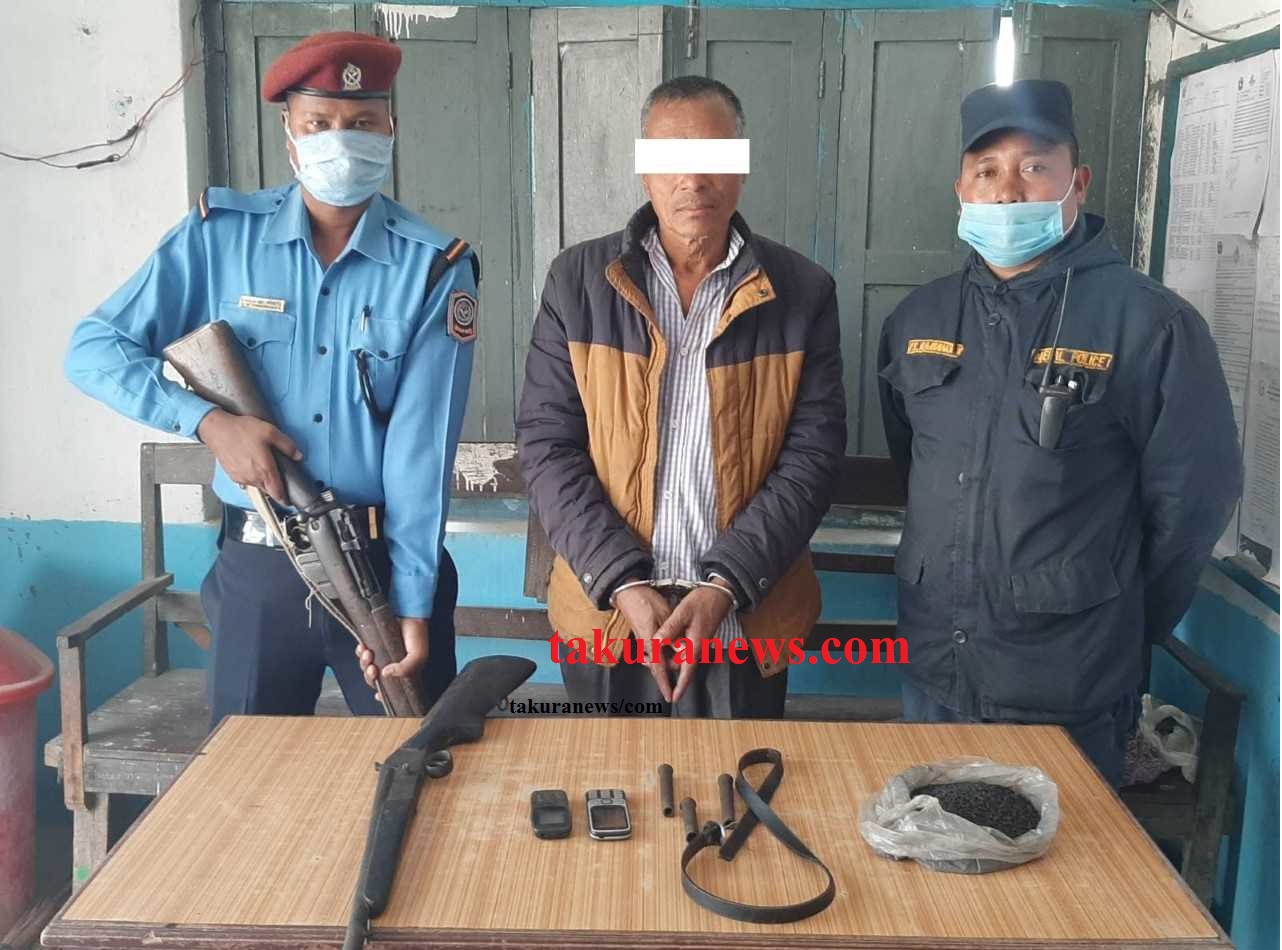 मोरङको मिक्लाजुङ १ सिलिलिङ बस्ने ५८ बर्षीय अरुण भन्ने अमृत बहादुर श्रेष्ठ हतियार सहित पक्राउ परेका छन् ।