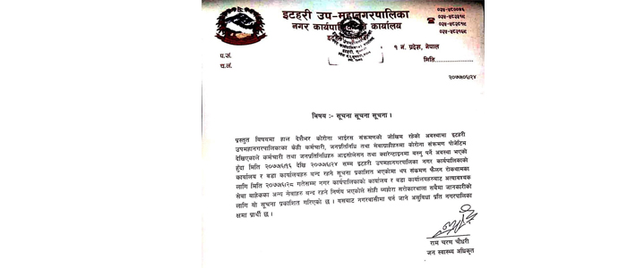 उनले आज एक सूचना जारी गर्दै जनप्रतिनिधि तथा कर्मचारीहरुमा कोरोना बढे सँगै अत्यावश्यक बाहेकका सम्पूर्ण सेवाहरु २८ गते सम्म बन्द रहने इटहरी उपमहानगरपालिकाले जनाएको छ । सर्वसाधरणहरुमा समेत कोरोना संक्रमणको दर बढ्दै गएको भन्दै सचेत हुन सर्वसाधरणहरुलाई आग्रह गरिएको छ ।